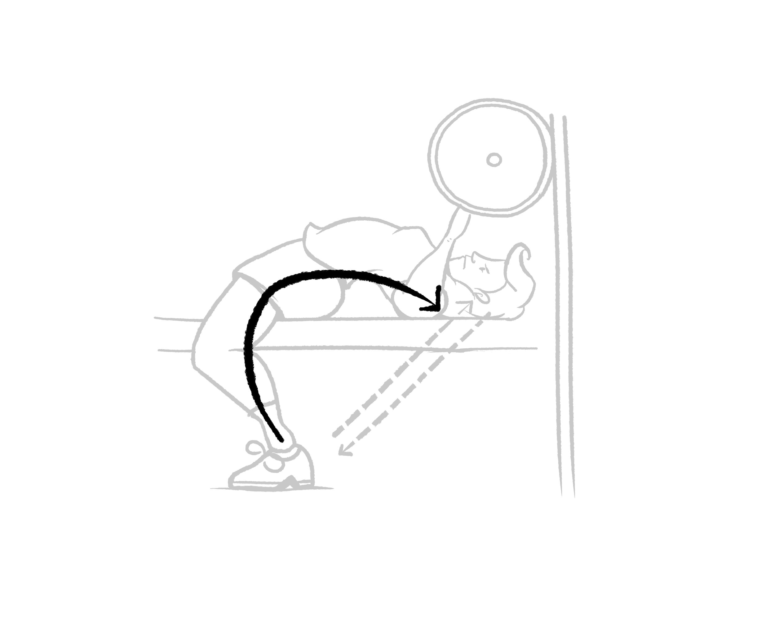 Once you find a secure foot position, driving your legs against the floor will transfer force horizontally along the bench (remember the third law?)--through the hips into the back--to reinforce the arch and chest position.